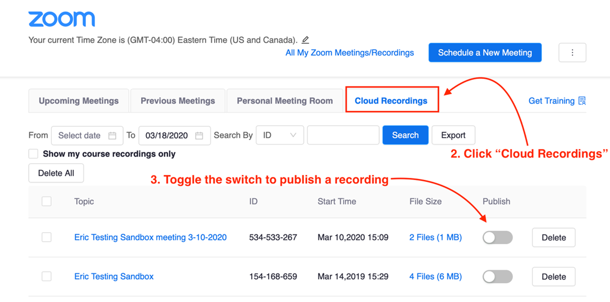 - Toggle the publish switch to make a recording available to your students